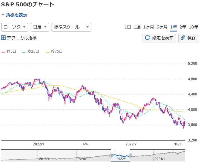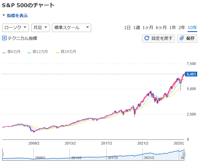 下記は米国経済を代表する約500社の株価から算出される、米国の代表的な株価指数「S&P500」のチャートです。